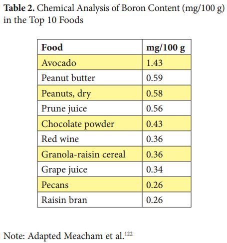 These five foods rich in boron that fit a testosterone boosting diet are: However, the consumption of specific foods with high boron content will increase its intake significantly. Boron in the medical field takes on the form of boric acid. Boron concentration in mg/kg, fresh weight basis. Boron supplements in therapeutic doses (3 mg/day) are probably safe to use 4.